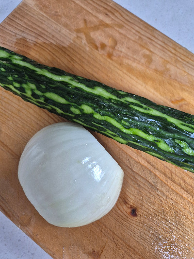 양념을 해놨으니 뭐라도 무쳐볼까 싶어서 오이 한 개와 양파를 준비해서 썰고