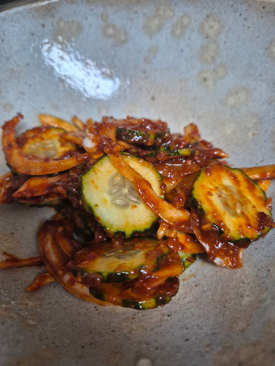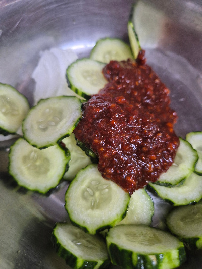 위에 쓰인 고추장 양념은 다하면 4 스푼가량의 양념이 나오는데 오이 반 개와 양파 1/4에 한 스푼을