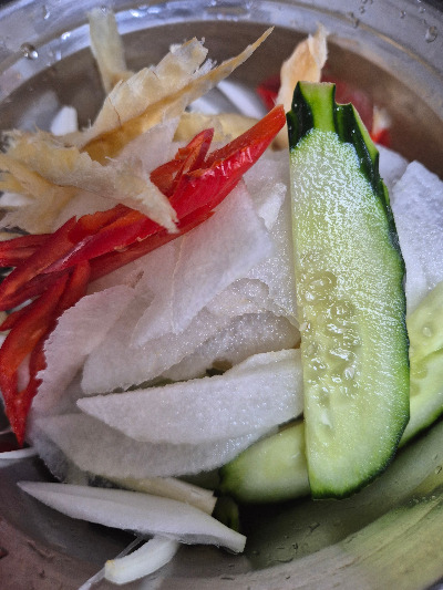 오이를 북어와 어울리게 세로 썰기 했는데 집에 무가 없어서 대신, 배로 대체하고