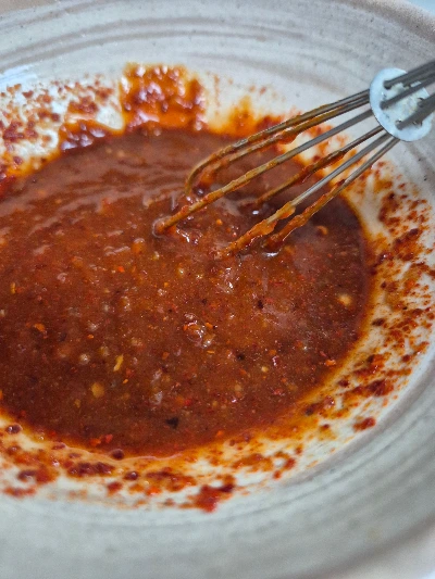 고주장 2 스푼, 고춧가루 1스푼, 다진 마늘 1/2 스푼, 간장 1스푼, 매실청 2스푼, 식초 3스푼.