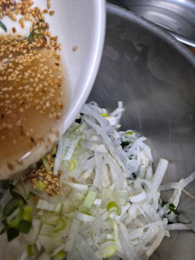 물을 빼는 사이에 무채를 되도록이면 곱고 가늘게 썰어서 소금 1과 설탕 1 숟갈을 넣고 재운다.