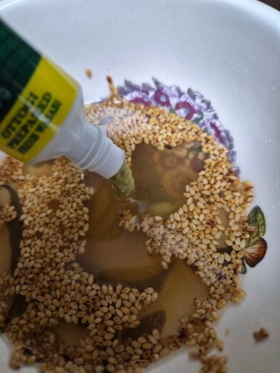 양념은 식초 6 소금 1 설탕 1 매실청 1 다진 파 그리고 깨를 준비해서 작은 볼에 섞어 준다.