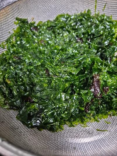파래를 체에 두고 위에서 꾹 눌러서 물기를 제거하고 무의 물도 체를 받쳐서 빼내고 꼭 짜준다.