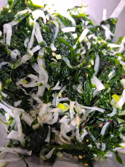 물기를 제거한 파래, 재워서 꼭 짠 무위와 다진 파를 넣고 양념을 부어서 힘차게 무쳐준다.