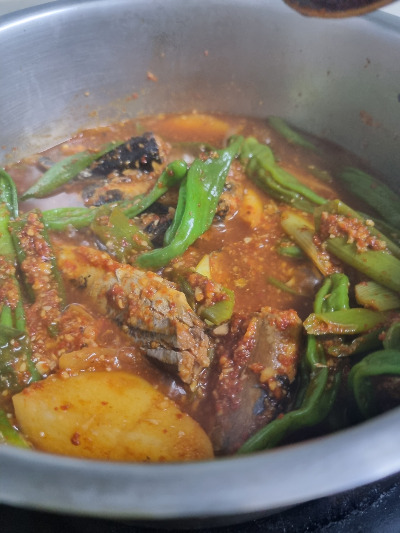 감자가 반 정도 익으면 꽁치 넣고 파, 고추 대강 넣고