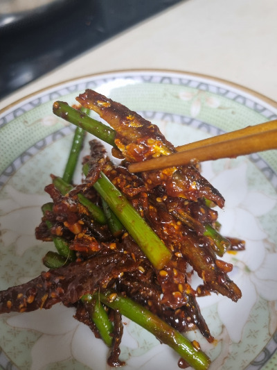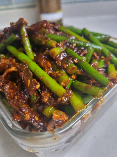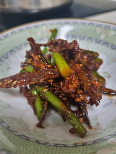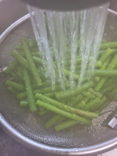 데우친 마늘종은 찬물에 헹궈 물기를 빼 주시면 돼요. 물론 꽈리고추도 좋은데 꽈리가 간을 입히기가 쉽지 않고 꼭지도 따기 귀찮아서 맛은 꽈리도 맛있으니 it 's up to you~~