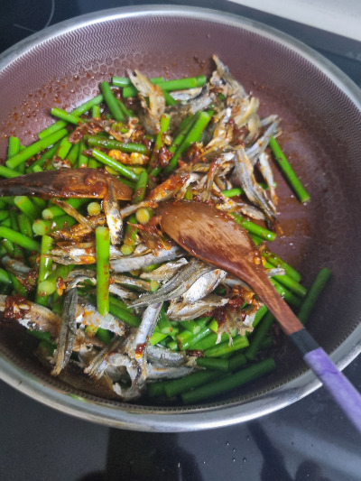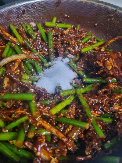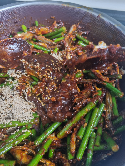 식힌 멸치와 물기 뺀 마늘종 투하 하시고 이제부터 나무숟가락으로