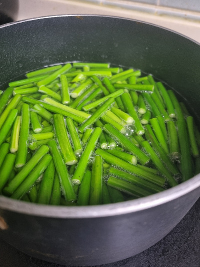 마늘종을 끓는 물에 40초 정도 익혀 주세요. 삶는 거 아니고 익히는 것도 아니고 끓는 물에 잠시 넣었다 뺴는 느낌으로.