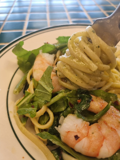 두~~ 둥 바질 버터 파스타인데 그린빈도 넣고 시금치도 넣고 루꼴라도 넣어서 초록초록 하다.