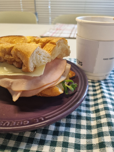 비싼 로메인, 치커리 라디오치아는 넣어 두고 돌나물이 시들한 게 있길래 케요네즈 바르고 돌나물 한층 깔고 삶은 계란 넣고 햄 깔고 치즈 넣고 대충 반개를 만들어 GS 커피를 하나 사서 샌드위치와 함께 우적우적 먹었다. 밤새 앓은 듯했는데 샌드위치를 먹고 나니 수업할만하겠다 싶었다. 돌나물이 샌드위치에 괜찮았다.