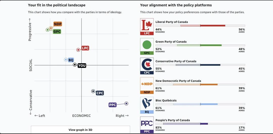 정치 지형도(Political landscape)를 보면 퀘벡블록이 제일 가깝고, 그 다음이 자유당이긴 한데 퀘벡블록은 캐나다 특수 정당이니 제외하는 것이 맞을 것 같다. (애초에 연방-주 관계나 분리주의 질문에서 나는 대개 don't know나 neutral을 택했다.)