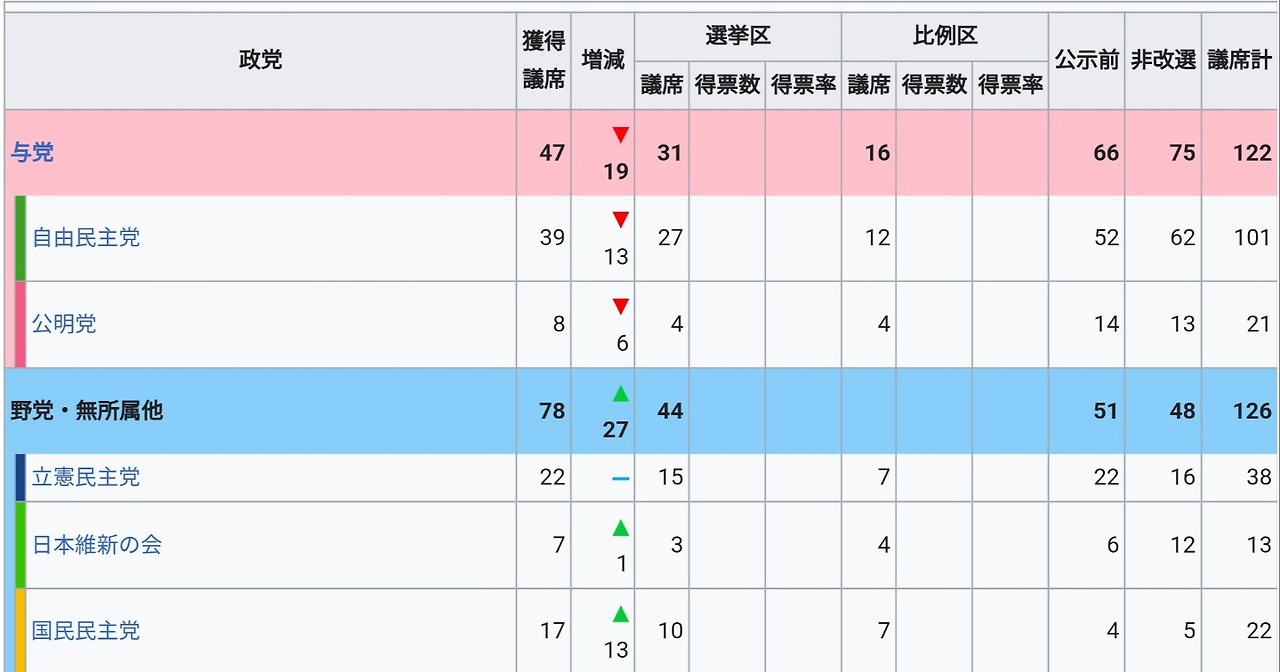→ 전체로는 승리지만, 자민당 단독으론 개선 의석 과반에 미달하는 1당