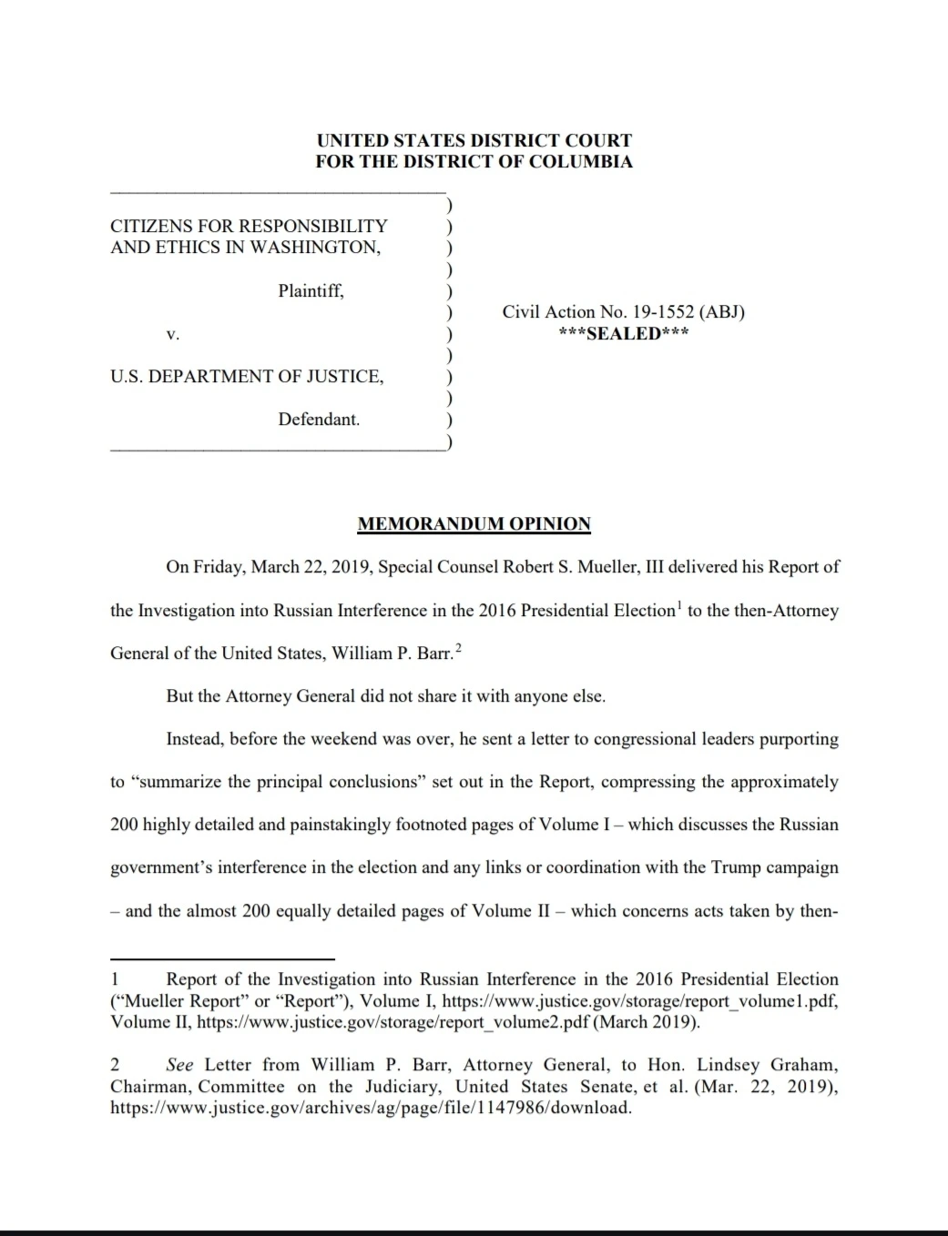 어쩌다 보니 미국의 판결문 하나를 읽게 되었다. 뮐러 특검 이후 2019년 3월에 도널드 트럼프 대통령에 대해 법무부가 특검 보고서 해석과 불기소 취지를 밝혔고 이를 당시 법무부장관 윌리엄 바(William Barr)가 의회에 서한(소위 'Barr letter')을 보내고 기자회견에서 공표했다. Citizens for Responsibility and Ethics in Washington이라는 정부감시 비영리조직이 이에 관한 법률자문국(Office of Legal Counsel)의 메모 등에 대하여 정보의 자유에 관한 법률(Freedom Of Information Act)에 근거해 법무부를 상대로 낸 정보공개청구소송(법률자문국의 메모 등을 공개)이다.