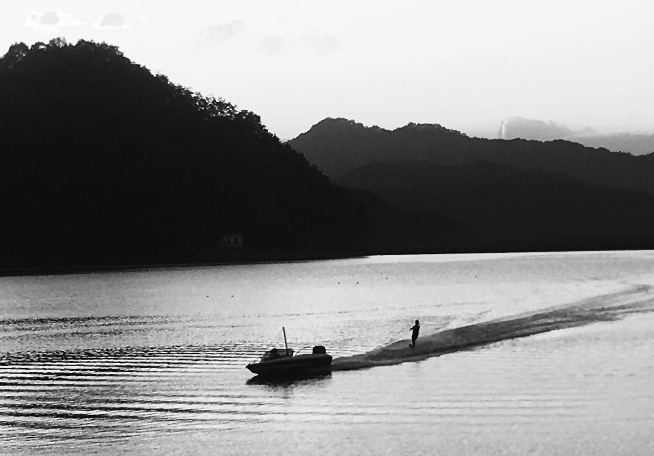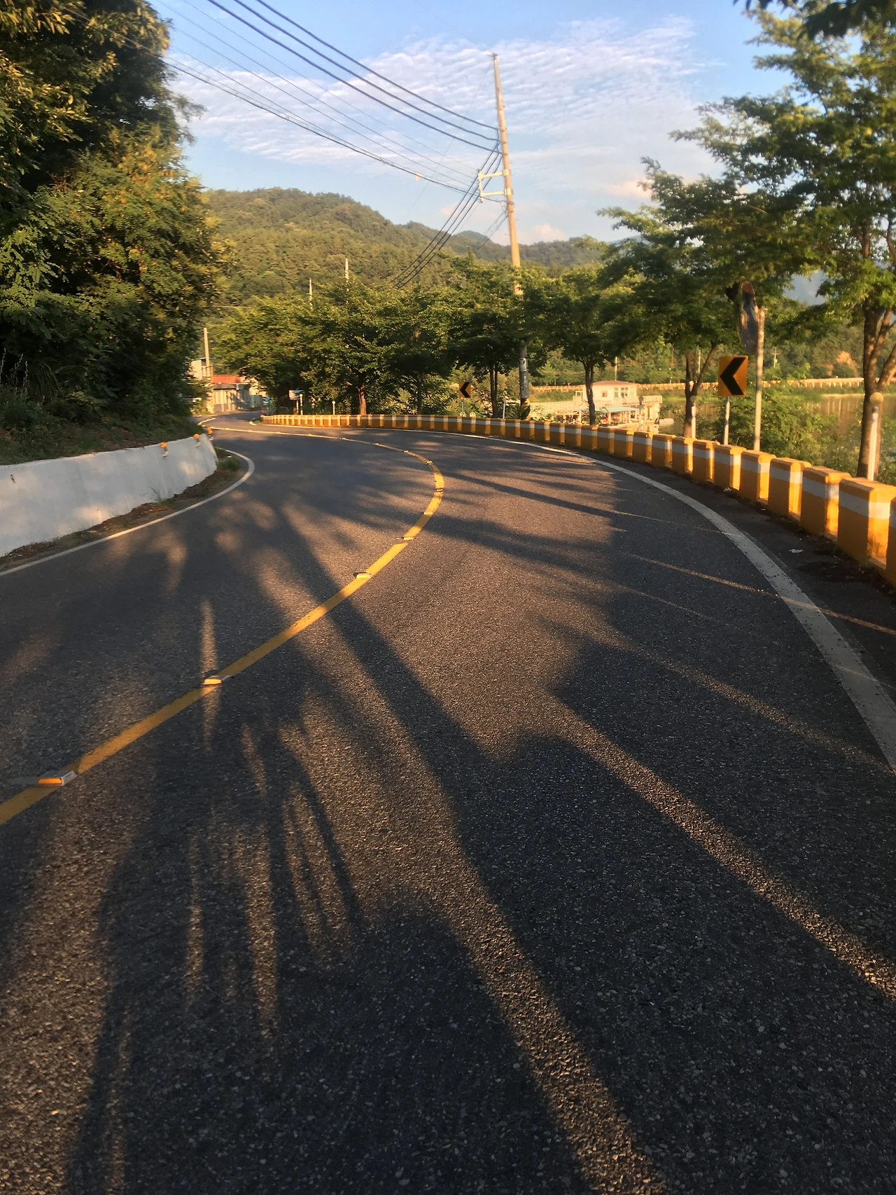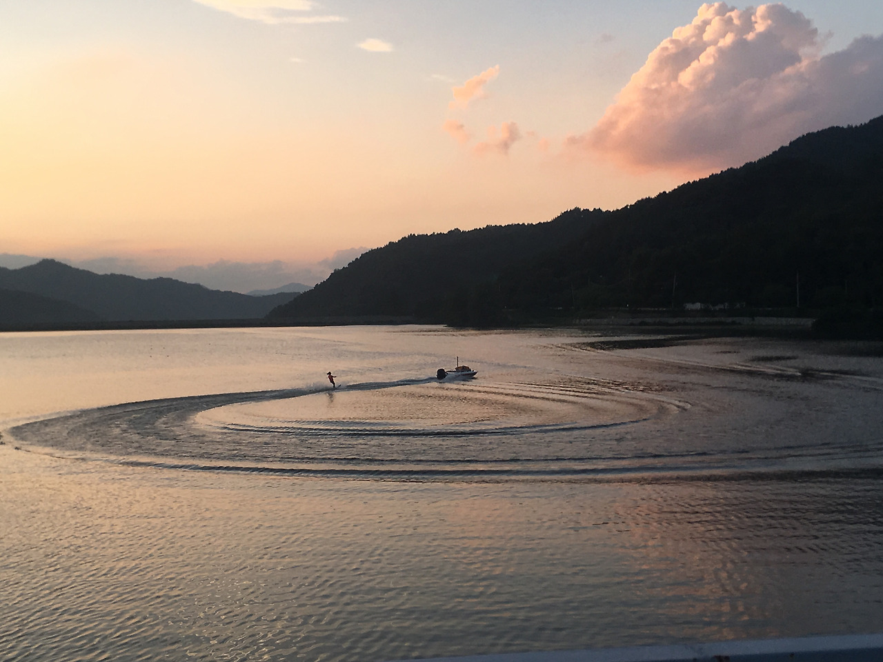 10리를 좀 넘어 달려가니 작지도 크지도 않은 저수지가 눈앞에 나타났습니다. 저수지에는 노을이 길게 늘어져 있었고 보트 하나가 수상스키를 끌려고 출발하고 있었습니다.