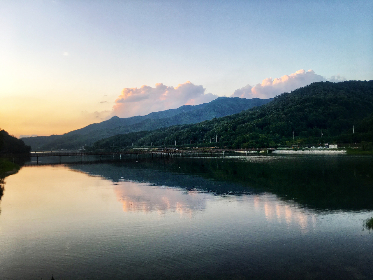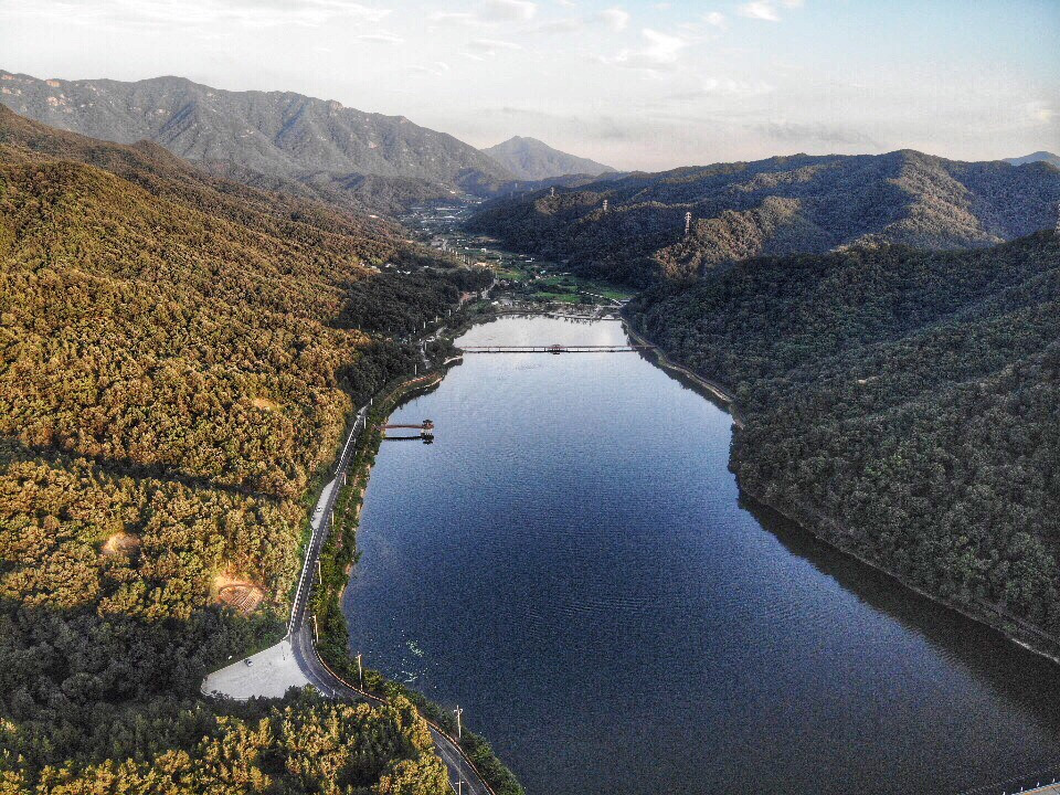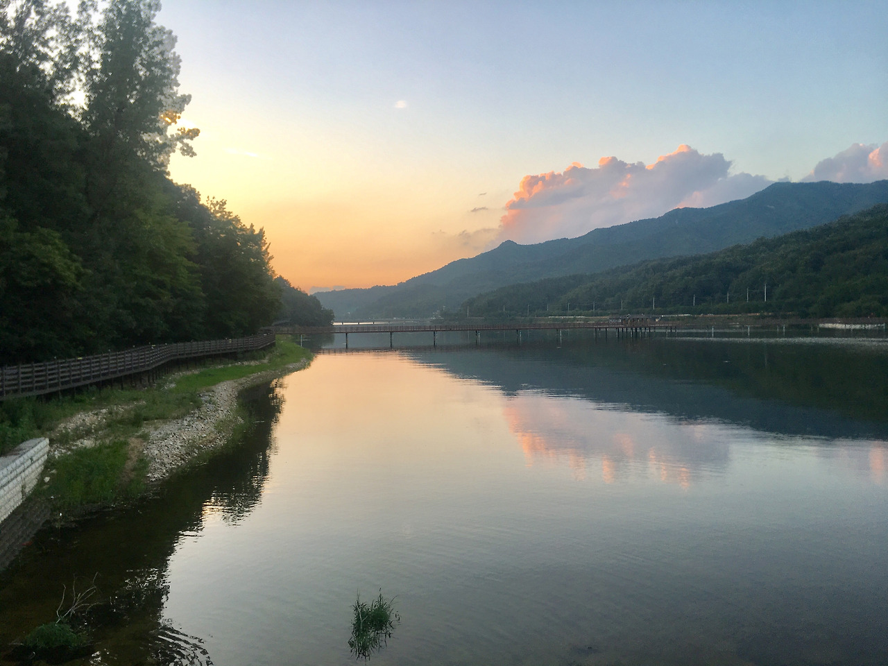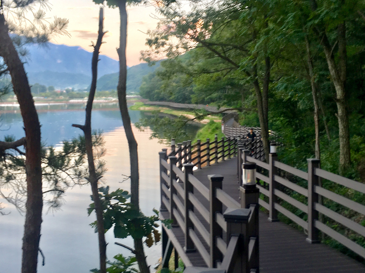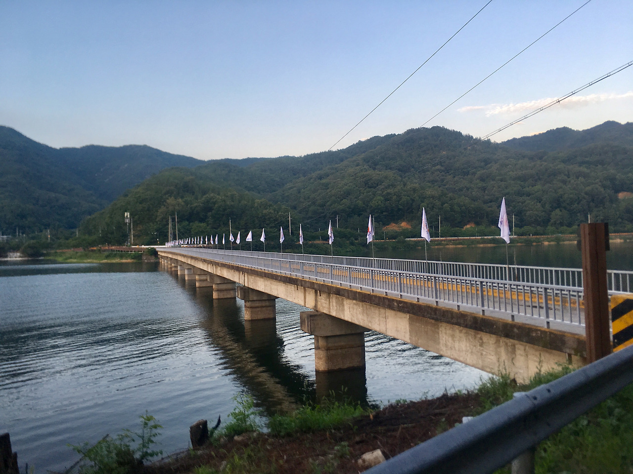 호수 가운데를 가르고 지나가는 다리가 있었습니다. 이 곳에 오면 누구나 사진을 찍고 간다는 산속 마을을 연결하는 좁고 긴 다리. 그 위를 지나 저수지를 가로질러 가니 산기슭 아래 길게 이어지는 멋진 데크 산책길이 있었습니다.