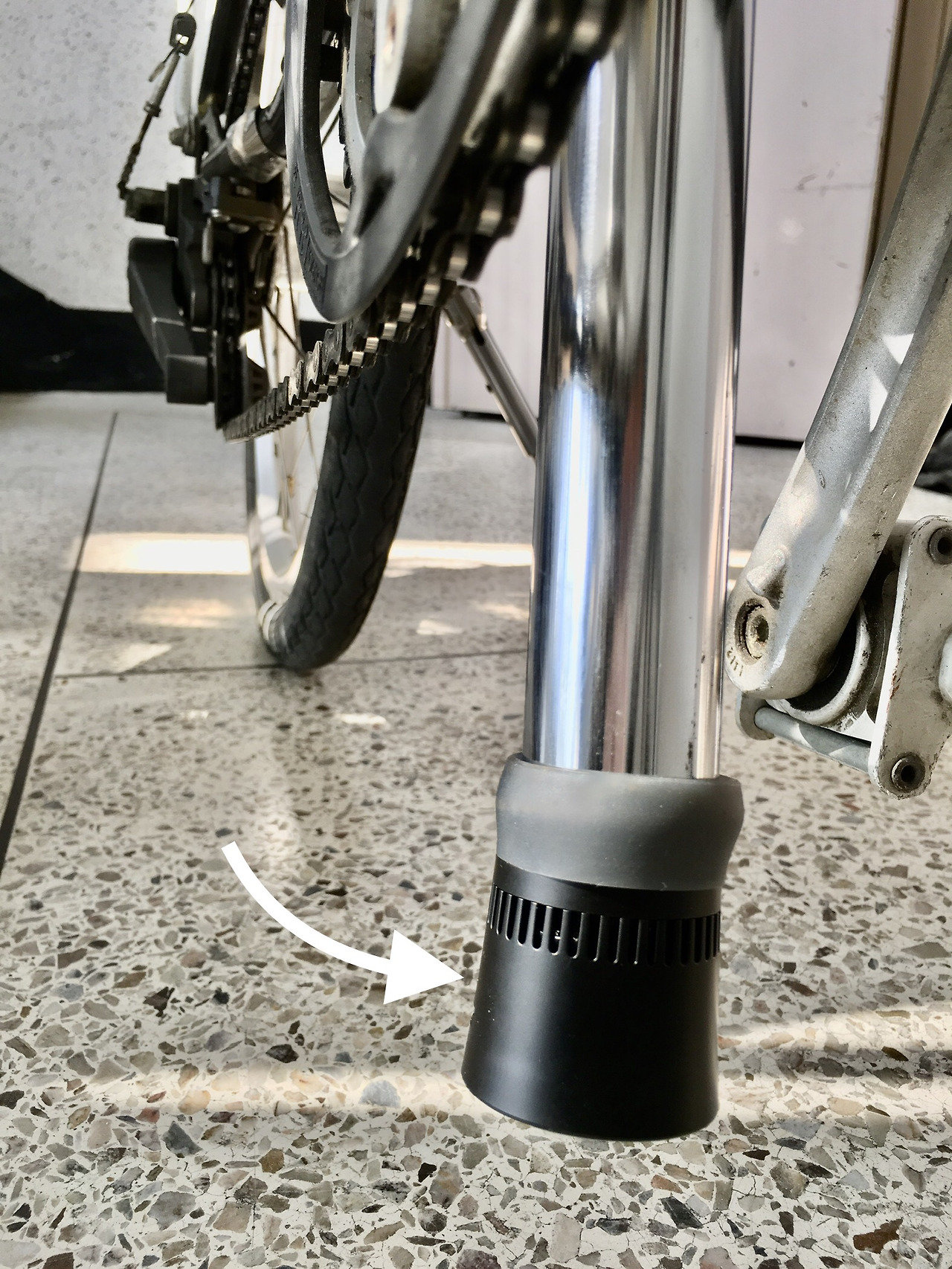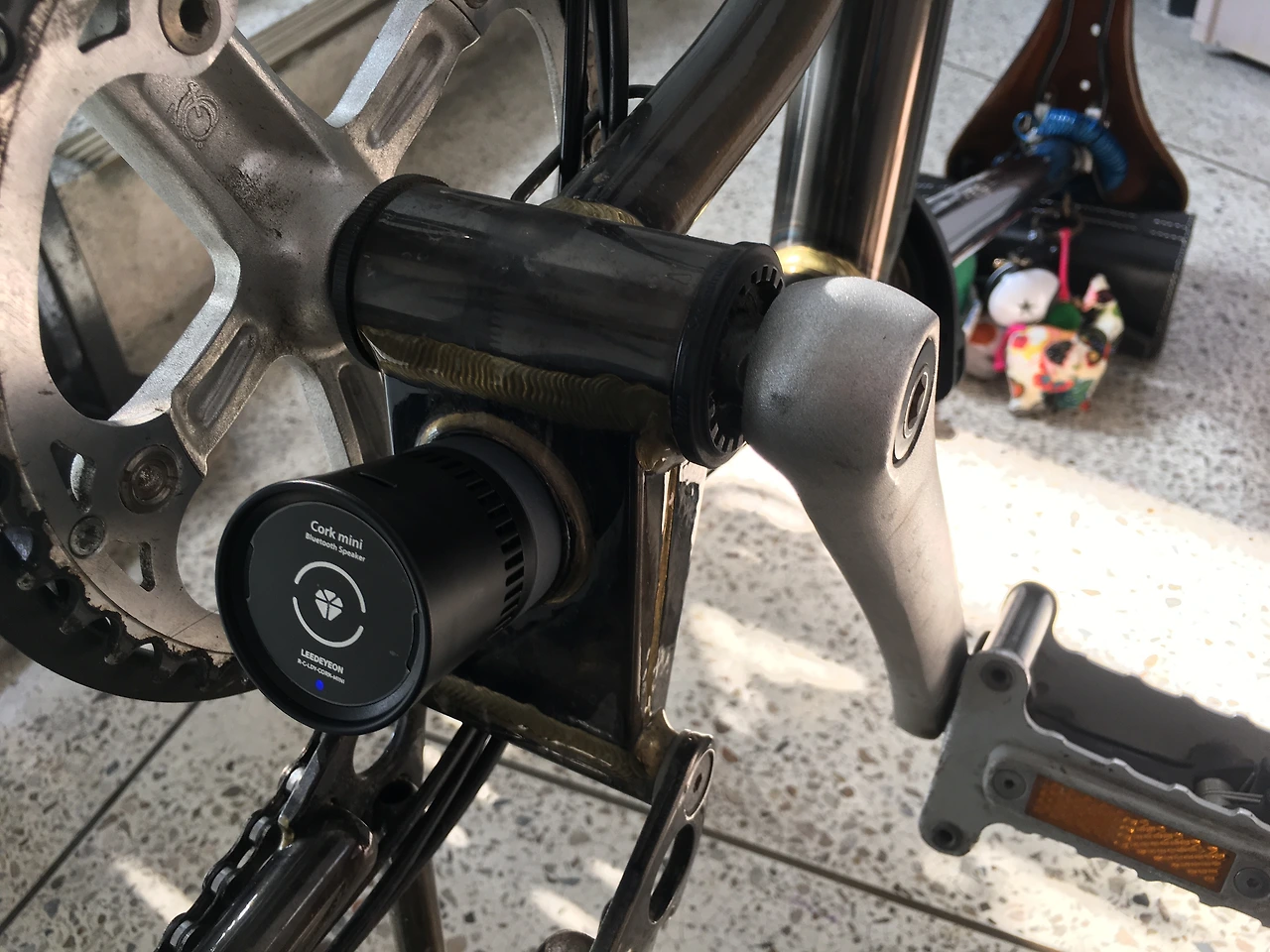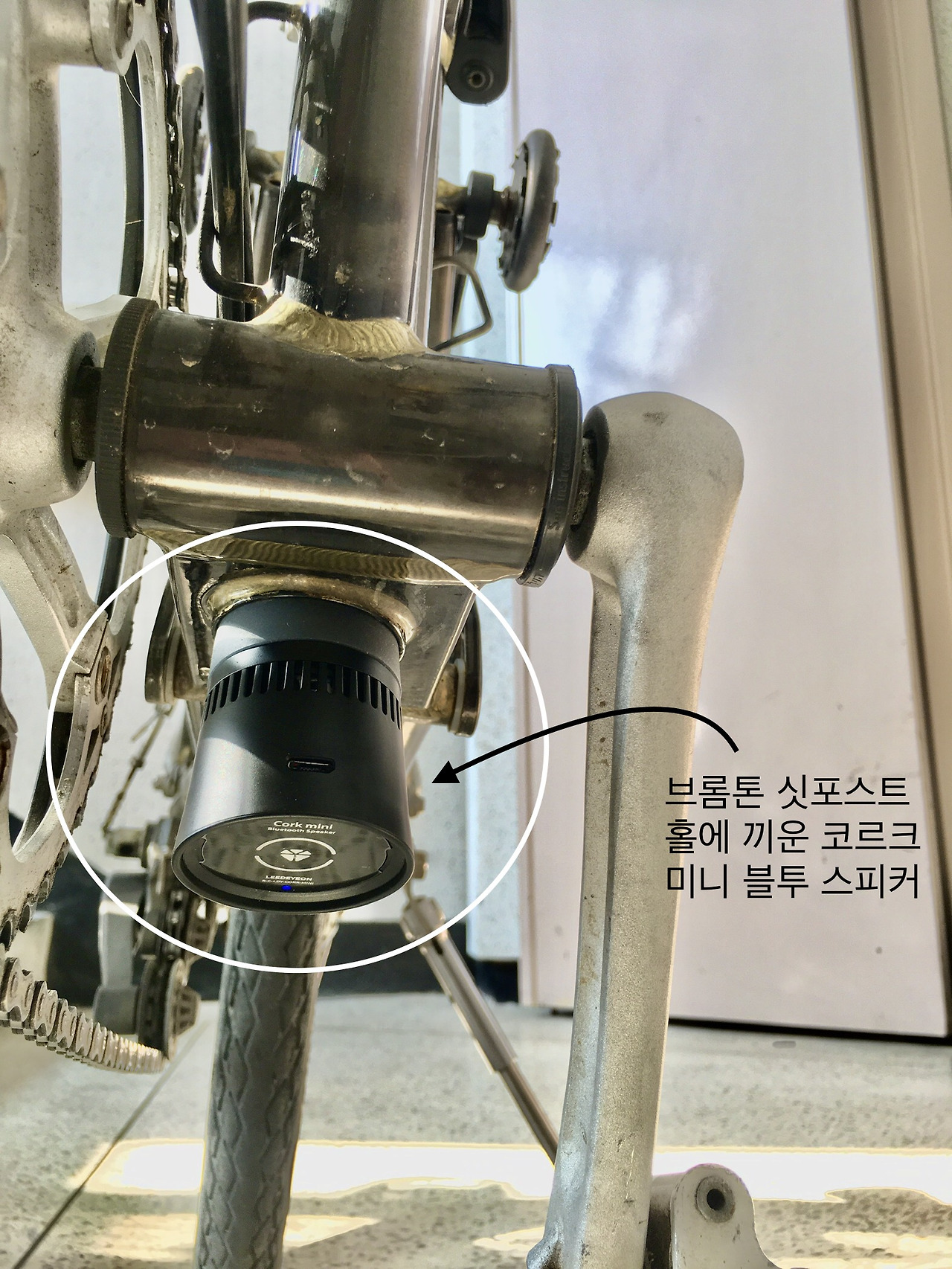 병만이 아니라 울림이 가능한 어느 것도 가능합니다. 병이 아닌 다른 방식으로 하면 어떤 소리가 날까 이리저리 해보다가 번뜩 떠오르는 것이 있어 브롬톤이란 접이식 자전거 싯포스트(안장지지대)에 끼워보았습니다. 길죽한 파이프 모양이 관현악기의 몸통과 같으니까요.