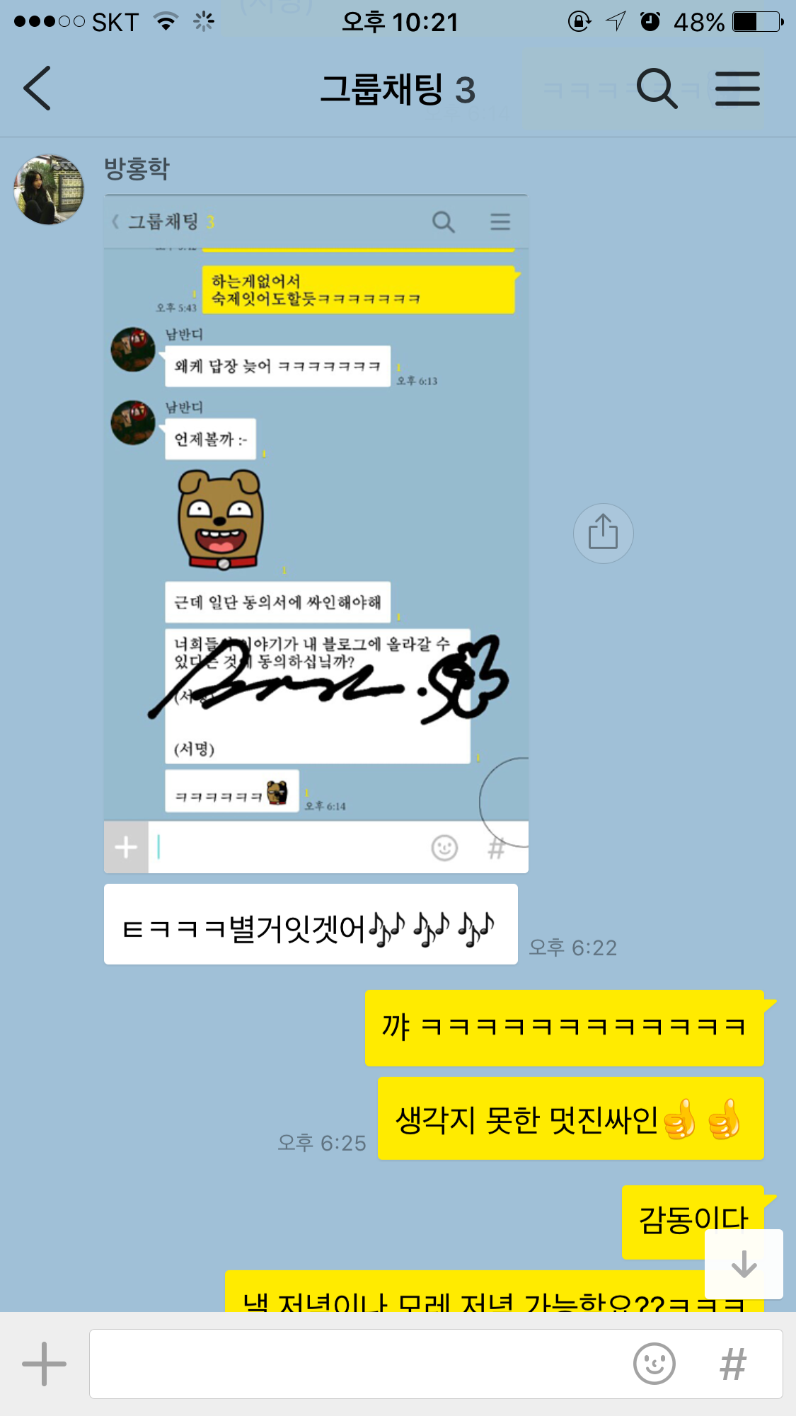 귀여운 내 친구들은 카톡 캡처에 싸인을 그려넣어주었당. (문지는 라이언이 대필 싸인)