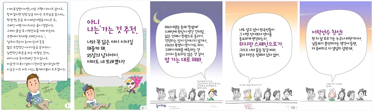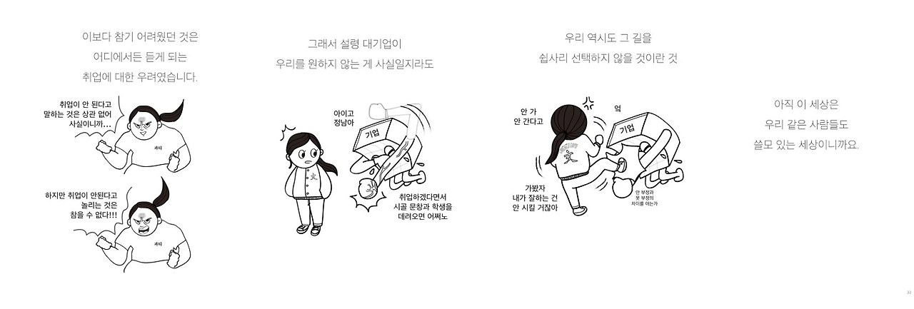 개중에는 학교를 3학년이나 다니고 나서 취업을 이유로 다시 전자과로 재입학을 해서 아직 저학년인 친구도 있었고, 사회복지 일을 하다가 도저히 못하겠다며 여군을 준비하는 친구도 있었다. 나는 내 친구들을 묻는 오빠의 물음이 주변 친구들과 나를 비교하며 나의 한심함을 일깨우려는 의도라고 생각했기 때문에 나의 친구들도 나와 별반 다르지 않다는 걸 열심히 설명하려 했다. 그러나 내 예상은 틀렸다. 나의 한심함을 일깨우려는 의도로 물었던 것은 맞았지만 오빠의 일깨워주고 싶어 했던 것은 문과 취업의 현실, 그 자체의 한심함이었다.
