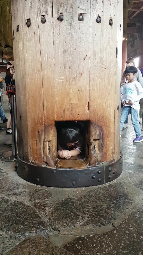 동대사에 가면 대웅전 기둥 하나에 구멍이 뚫려있는데, 이 구멍을 통과하면 액운이 사라지고, 아이들은 공부를 잘하게 된다고 합니다. 당연히 그 말에 우리 아이들도 구멍을 무사히 통과했습니다.