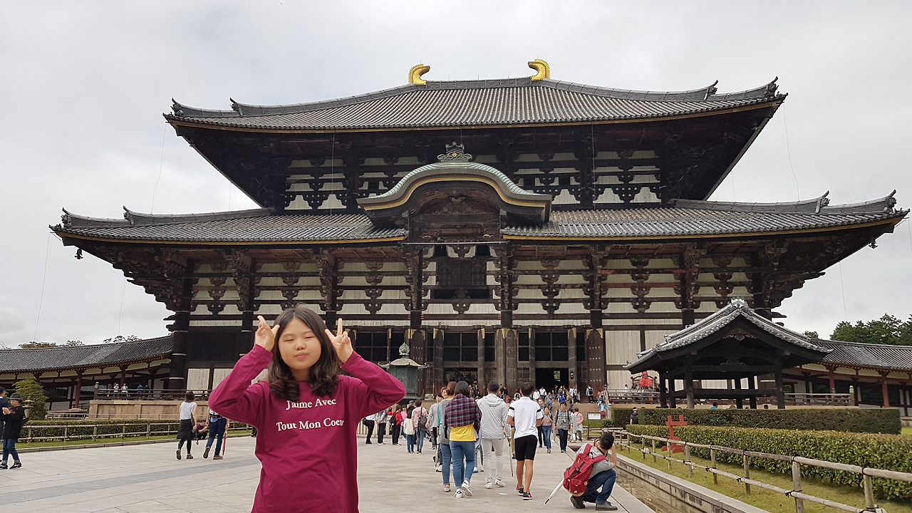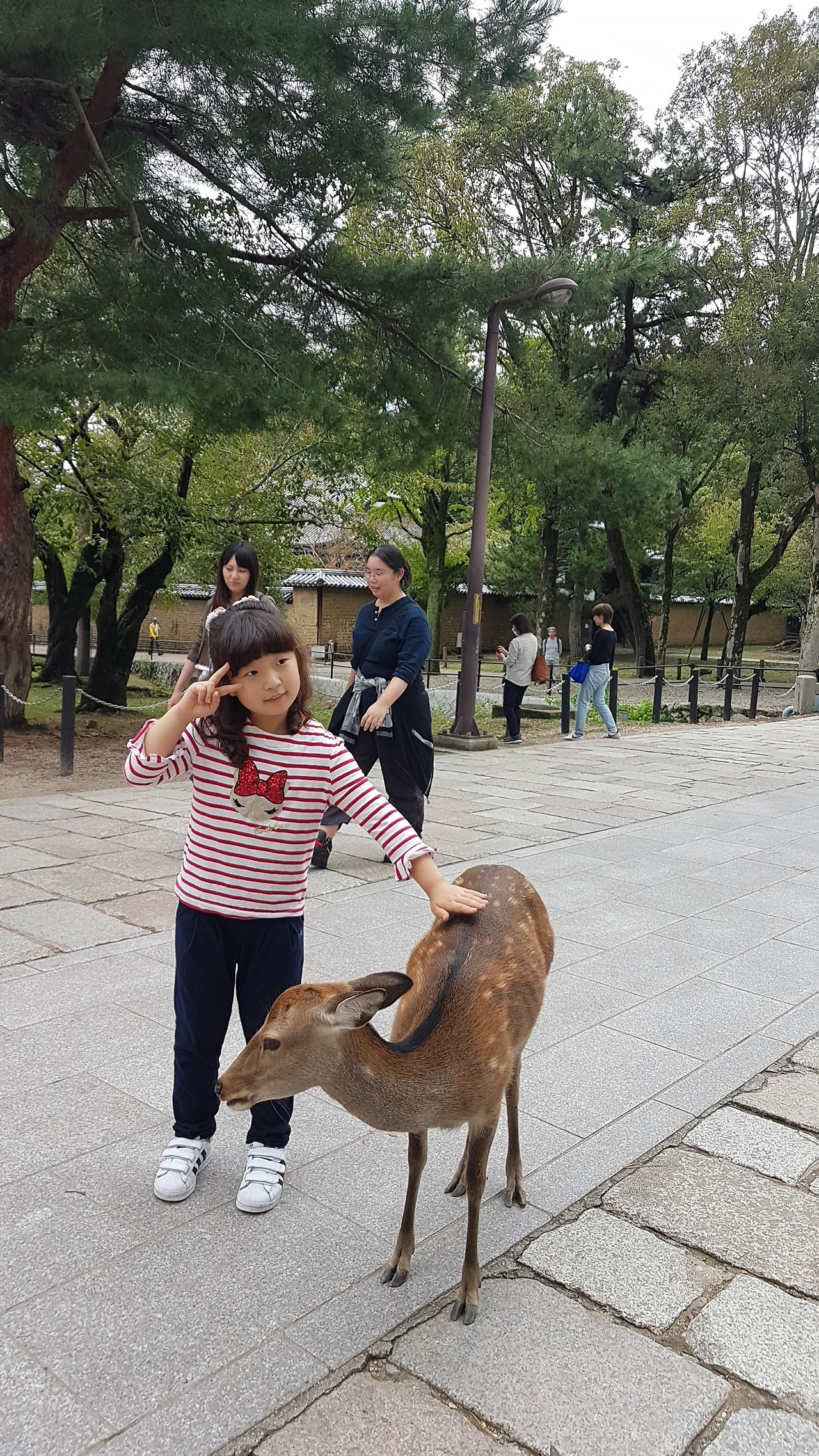 일본행 아침 출발 패키지는 현지에 도착하자마자 투어를 시작합니다. 1시간 반가량을 달려 '세계 최대의 단일 목조 건축물'인 대불전이 있는 '나라(Nara)'에 있는 '동대사(도다이지)'에 도착했습니다. 여기는 사슴들의 천국이라고 불리우는데요. 일본 사람들이 신성시하고 좋아하는 동물이 3개 있는데 그 중의 하나가 사슴입니다. (월령공주라는 애니메이션을 보면 사슴을 타고 다니고, 생명의 기원을 주관하는 신도 사슴 모양을 하고 있죠) 여기 사슴들은 아무거나 먹이면 안되고, 입구에서 사슴용 센베를 100엔에 팔고 있으니 구입하시면 됩니다. 다만, 센베를 보자마자 사슴들이 떼로 달려드니 가방에 숨기셨다가 사슴이 뜸한 곳에 가서 주시는게 좋습니다. (안그러면, 우리 애를 사슴떼가 덮치는 광경을 보시거나, 우리 애가 사슴을 발로 걷어차며 소리지르는 걸 보시게 될 거에요)