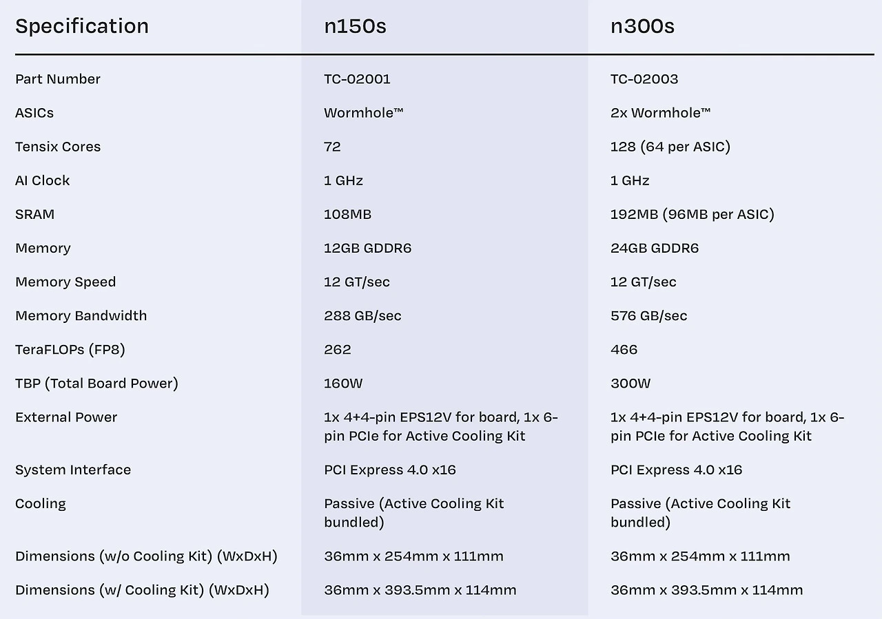< Wormhole의 대표 모델 n150/300s 기술스펙 – 출처 / tenstorrent >