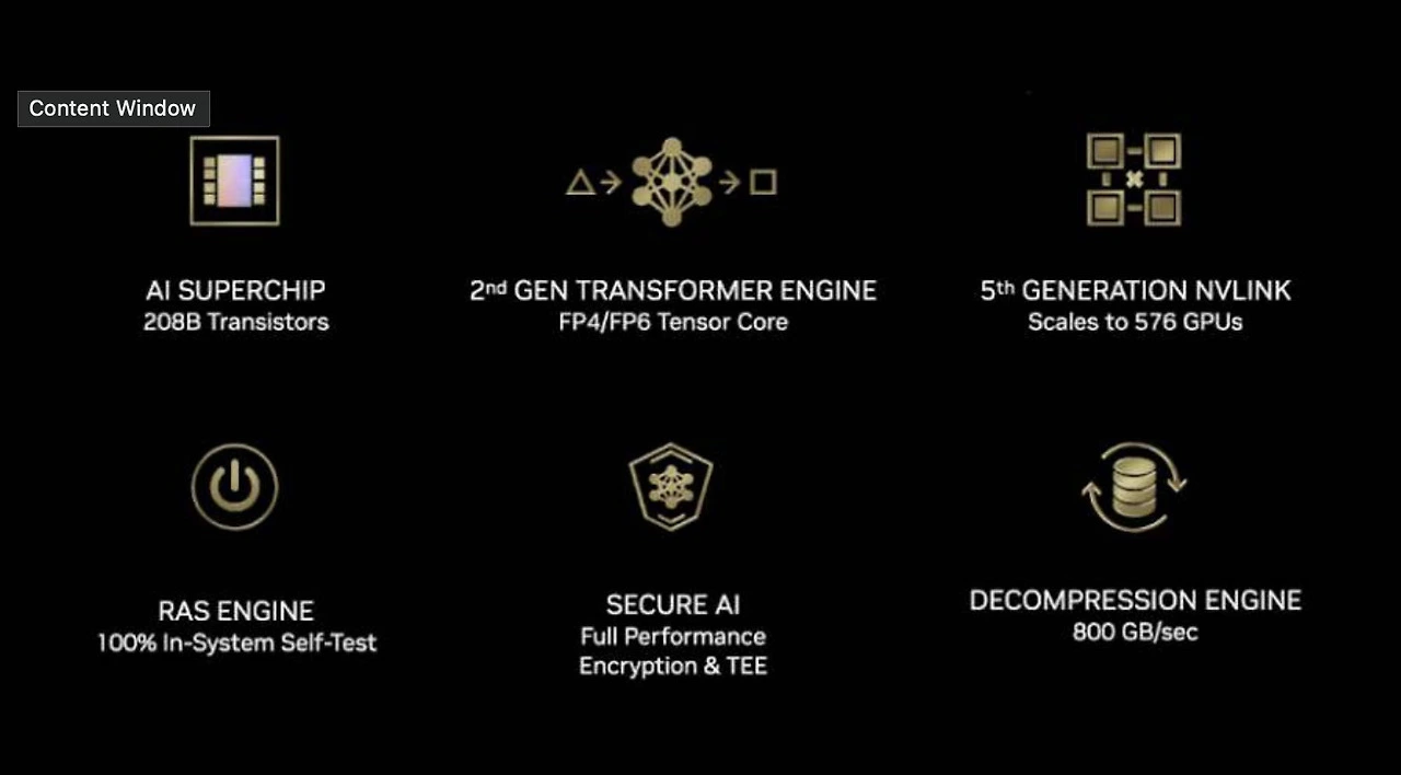 엔비디아는 AI 연산 및 데이터 센터 시장에서의 독보적인 위치를 유지하기 위해 끊임없이 혁신하고 있는데요. 그 결과물이 바로Blackwell이라는 새로운 GPU 아키텍처입니다. 이 아키텍처는 엔비디아의 기존 호퍼(Hopper) 아키텍처를 계승했지만, 2세대 트랜스포머 엔진이 탑재되어 기존 시리즈보다 더 놀라운 성능으로 대규모 AI 모델을 실시간으로 처리할 수 있는 능력을 가지고 있습니다. 또한5세대 NVLink를 통해 수 조개의 파라미터를 처리할 수 있어 초당 8 테라바이트의 양방향 처리를 할 수 있어, 여러 GPU가 동시에 데이터를 빠르게 주고받을 수 있게 합니다. 이는 AI 모델 훈련 및 추론 과정에서 발생하는 병목 현상을 최소화하고, 전체 연산 속도를 크게 향상시킬 수 있죠.