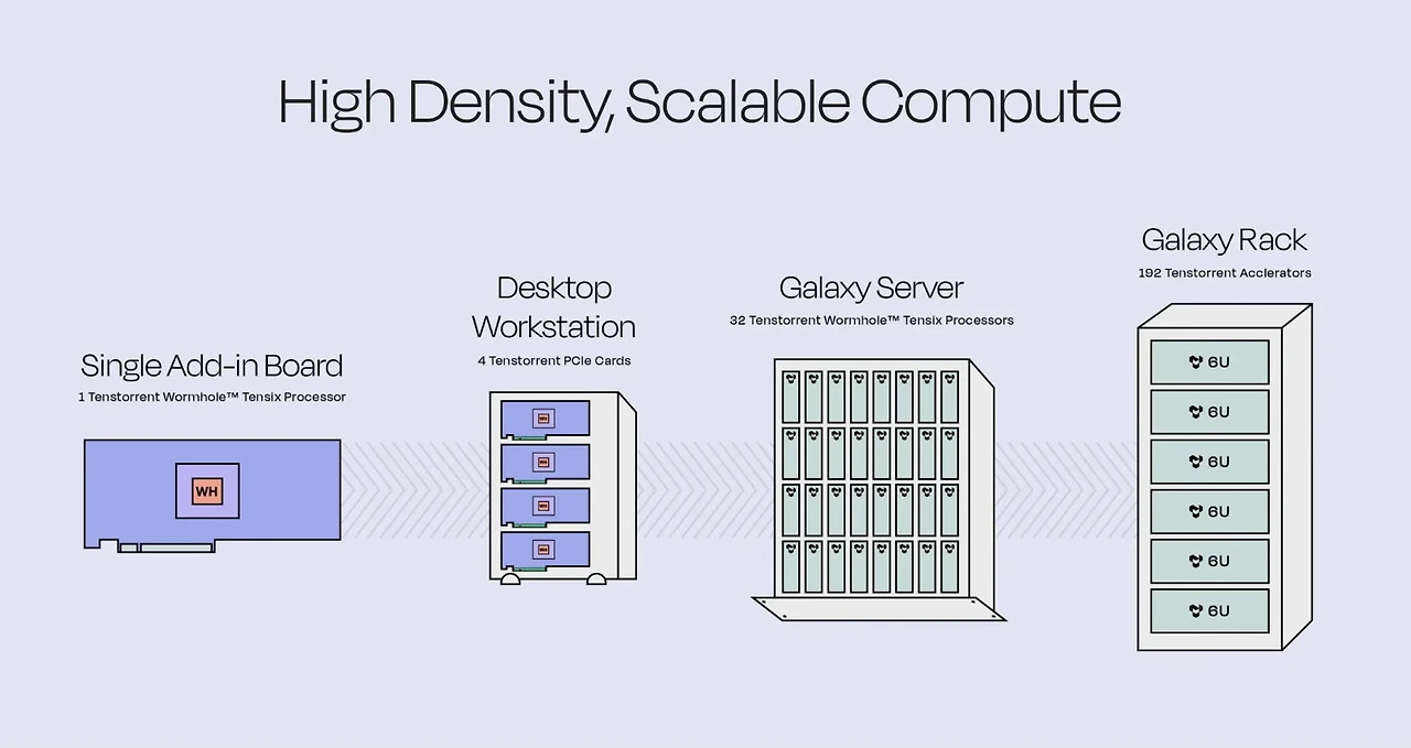 그 대표적인 결과물이 바로 Galaxy 모듈입니다. Galaxy 모듈은 여러 개의 Tensix Core를 결합하여 고성능을 제공하며, 특히 확장성과 전력 효율성에 중점을 두고 설계되었습니다. 이는 대규모 데이터 센터와 HPC 환경에서 엔비디아의 값비싼 장비들로만 구성하는 것에 비해 유리한 선택이 될 수 있습니다.