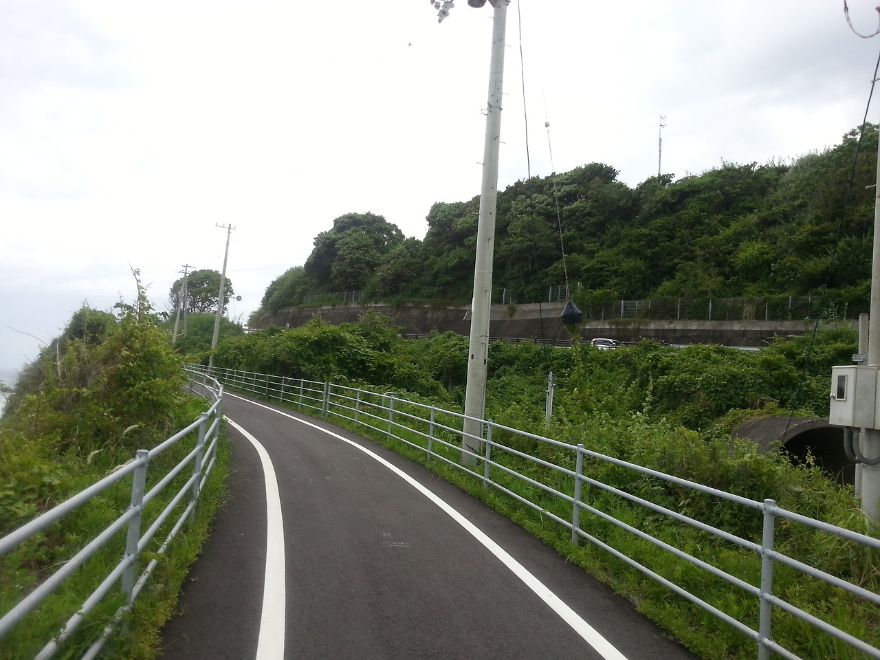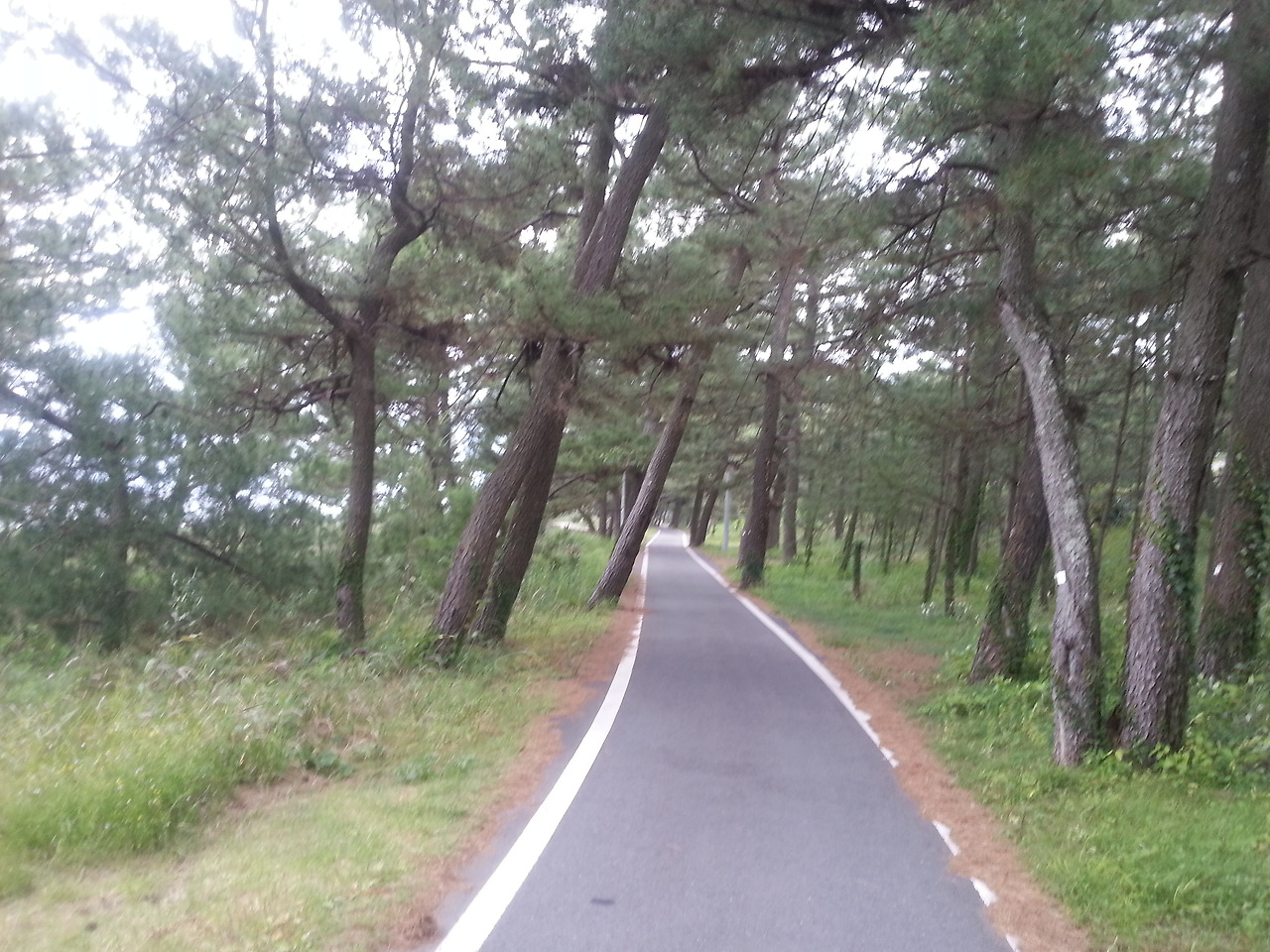 해안으로 아름다운 자전거길이 뻗어있었다. 송림 속으로 1 km 가량 조용한 길이 이어지기도 했다. 어둑어둑 해가 지고 있었지만 오르막도 없고 자동차 길과 완전히 구분된 자전거도로라 마음은 가벼웠다. 자동차 도로가 는 산 위로 새로 뚫려 있는 것으로 보아 옛길을 자전거길로 낸 것 같았다.