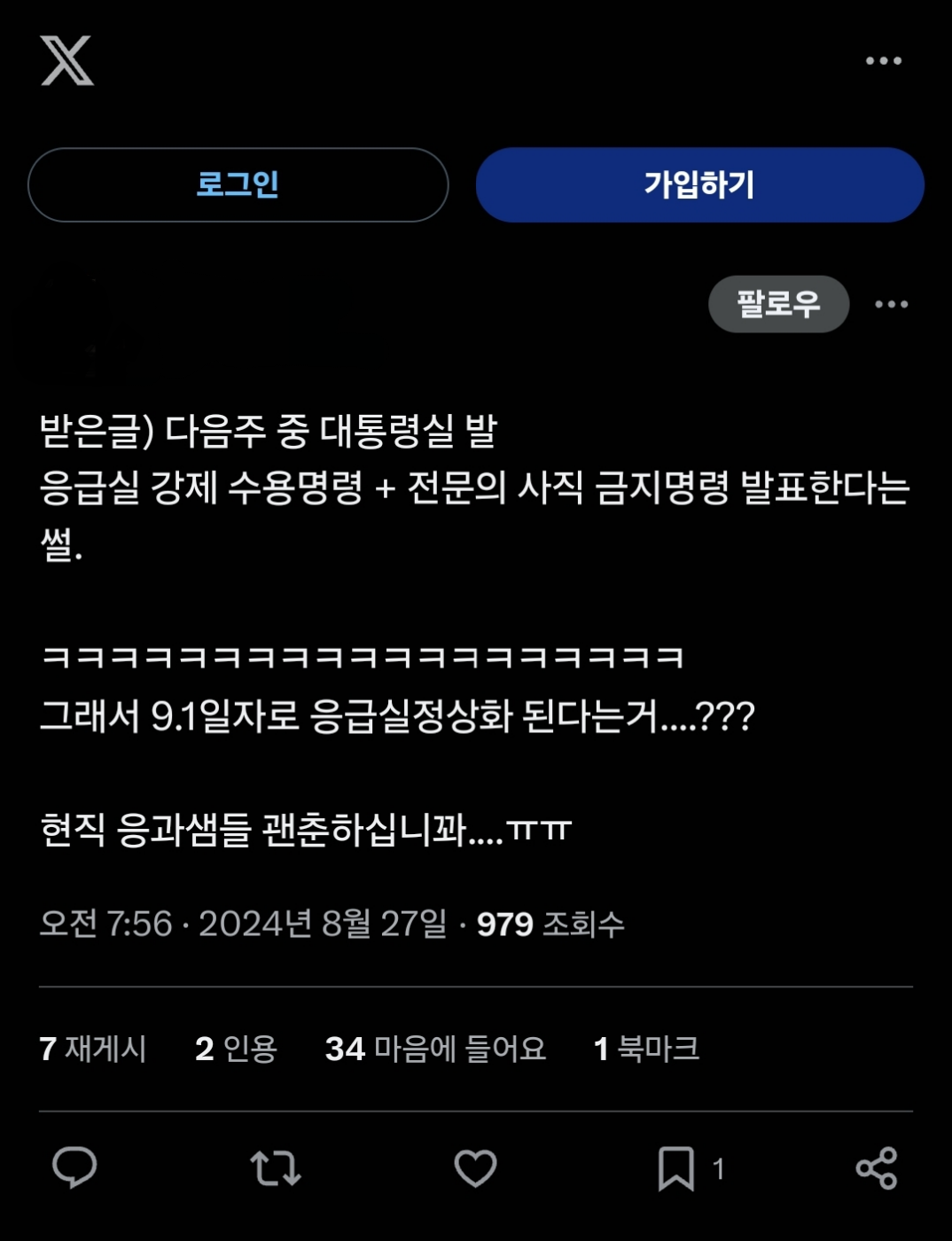 일단 응급실부터 괴사하기 시작하는 모양이다. 전문의들이 줄줄이 사직했다는 뉴스가 들리더니 어제는 이런 소문이 돌았다