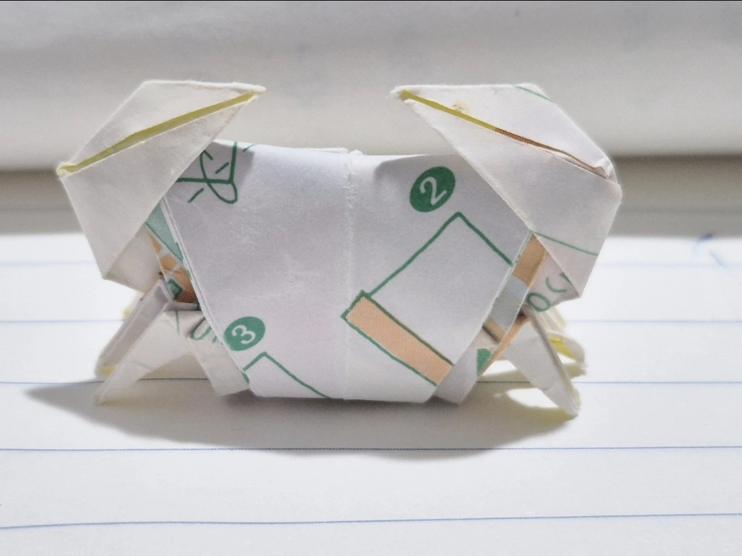 그러면 새로운 문제가 생기는데, 이 게는 사실 완벽한 좌우 대칭은 아니게 된다. 정사각형의 꼭짓점에서 온 다리를 A라고 하고 변에서 온 다리를 B라고 할 때, 실제로 접어보면 한쪽은 ABAB순으로 정렬되고 반대쪽은 BABA순으로 정렬되기 때문이다. 그것 또한 아무렴 어떠랴 그냥 그런 '게'라고 하고 넘어갔더니 생각보다 결과물이 괜찮아서 뿌듯했다.