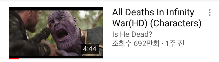 <인피니티 워>의 블루레이가 발매되자 마자 유튜브에 관련 편집 영상이 하루에도 수십개 씩 올라온다. 그 중 눈여겨 볼 지점은 영웅들이 죽음에 이르는 순간만을 편집한 영상인 것 같다. 게시된 지 일주일만에 700만에 가까운 사람들이 이 영상을 보았으니 말이다. 당연한 반응이라 여길수도 있지만 이미 불법 촬영물이 다수 유출된 영화인데다, 개봉된 지 3개월 가량이 지났다는 점에 이 현상은 조금 특별하게 다가온다. 또 짚어봐야할 지점은 영화 속 재현된 영웅의 죽음보다 여기에 급속히 몰려들고 있는 사람들의 심리가 대체 무엇일지가 아닐까 싶다. 말하자면 사람들은 영웅의 죽음에 매혹됐거나, 아니면 간절하게 이들이 사라지길 바라는 것처럼 보이기까지 한다.