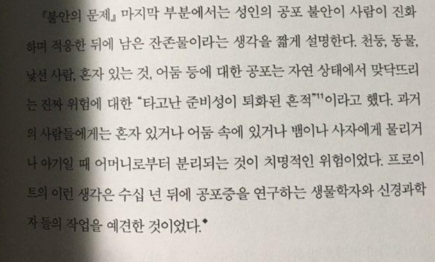 관련 자료를 찾아보던 중 <나는 불안과 함께 살아간다>의 저자인 스콧 스토셀은 <불안의 문제>라는 책을 인용해 분리 불안 증세를 다음과 같이 진짜 위험에 대한 "타고난 준비성이 퇴화된 흔적"이라 말했어요. 쉽게 말해 이런 두려움과 공포는 우리가 실제로 두려운 상황에 맞닥뜨렸을 때 느끼는 공포보다, 우리가 그 상황을 미리 예견했을 때 피어 오르는 감정들이 우리를 두려움과 불안으로 이끌기 때문이 아닐까란 말입니다.