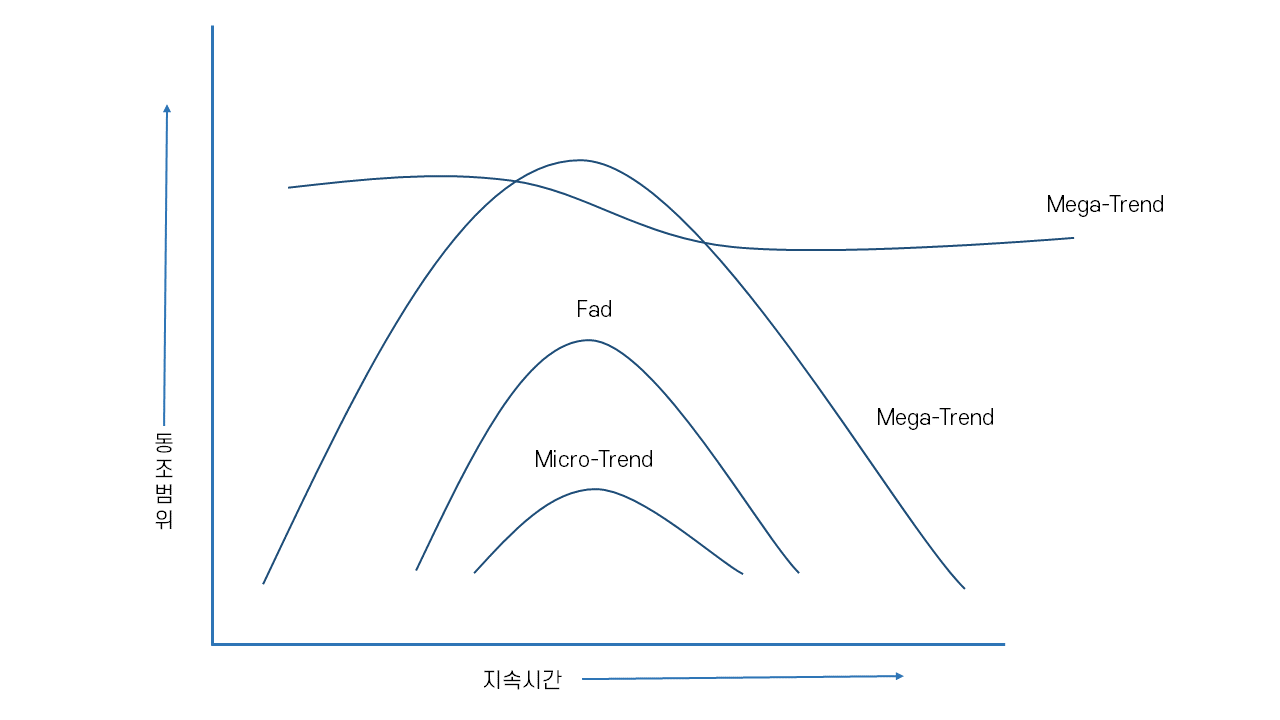 상품과 서비스도 유행과 트렌드가 존재한다. 이 유행이 일시적으로 소멸될 것인지, 트렌드로 번질 것인지를 판단할 수 있다면 상품 기획에 도움이 된다. 하지만, 더 중요한 것은 우리 회사와 브랜드의 타깃층의 트렌드를 파악하는 것이다. 앞서 언급한 것처럼, 이제는 같은 인구통계학적 특성을 가진 소비자들도 각기 다른 유행과 트렌드로 나뉘기 때문이다.