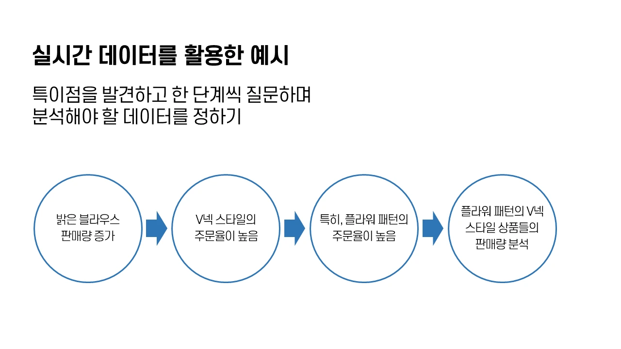 실시간 판매 데이터로는 맥락적인 접근이 가능하다. 밝은 색 블라우스가 잘 팔리네? 그럼 어떤 스타일이 잘 팔릴까? V넥이 잘 팔리는구나. 그럼 최근 3개월 간 밝은 색의 V넥 블라우스 상품들의 판매 추이를 살펴보자.