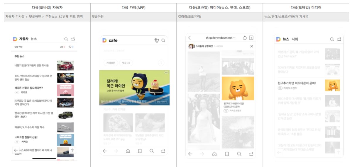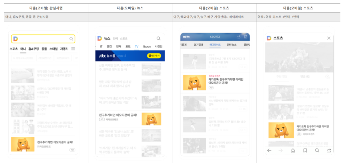 매체별로 광고가 노출이 되는 지면을 먼저 수집한 뒤 어떤 매체의 어떤 지면에 광고를 노출시킬지를 설계하고 광고 운영을 시작하는 것도 좋은 방법입니다. 저도 카카오모먼트 디스플레이 광고를 운영하면서 효율을 높이기 위해 많은 고민을 했었는데요. 타깃에 맞는 매체의 지면을 필터링하고, 매체와 지면에 핏이 맞는 메시지를 광고에 담으면서 효율이 크게 상승했던 경험이 있습니다.