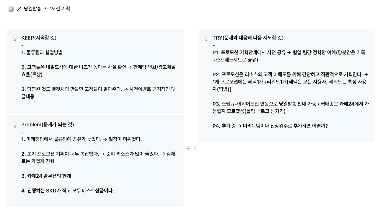 문제가 된 것(Problem)에서는 특정 인원과 잘못한 점을 정확히 짚고 넘어갔습니다. 예를 들어, 프로모션 일정을 물류팀에 늦게 공유한 사람은 저였습니다. 제가 늦게 공유했고, 늦게 공유해서 어떤 문제가 발생했는지를 정확히 짚고 넘어가는 방식으로 회고를 진행했습니다.