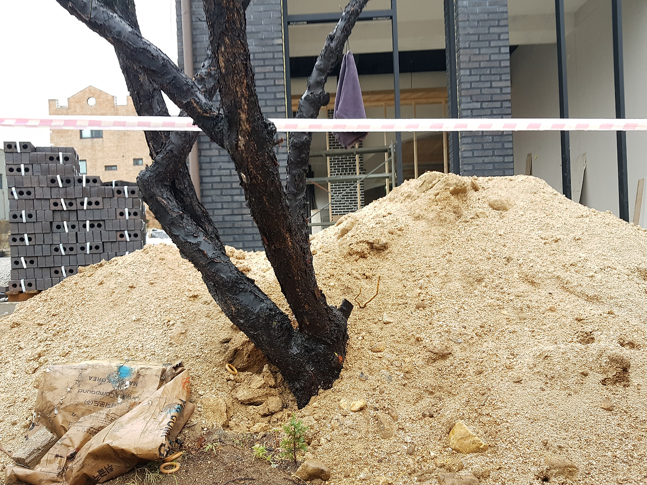 자세히 보면 가지도 남겨 있지 않고 잘랐다. 그 몸통에서 홍매 한 꽃잎 피어 있다. 학교로 옮기려니까, 좋은 나무 인가 보지요? 하면서 탐욕의 욕정을 드러낸다. 욕심 이전에 제대로 나무에 대한 예의라도 지켰으면 좋겠다. 만나서 협의하였지만, 며칠 만에 저 지경으로 나무를 방치한다. 지금은 건물을 올리고 짓는 일 말고는 신경 쓸 여력이 없나 보다. 바닥을 긁어보니 아스팔트 경계를 중심으로 이식할 분 만들기에 겨우 들어온다. 가지가 없어서 옮겨 심고 나서 활력을 받을까가 매우 걱정이다.