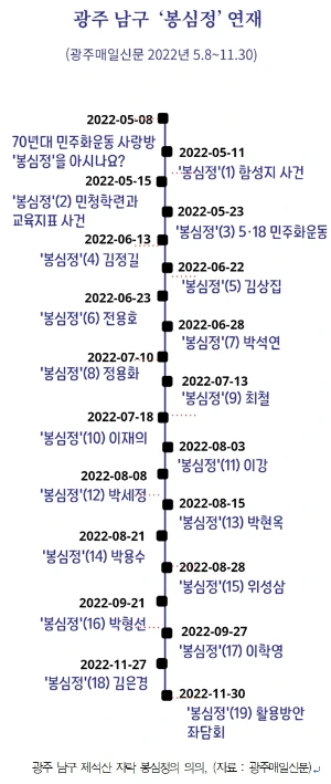 봉심정을 찾기 위하여 자료를 조사한다. 때마침 《광주매일신문》'에서 ‘오복’ 기자의 「70년대 민주화운동 사랑방 ‘봉심정’」 기획 기사를 만난다. 작년(2022년) 5월 8일부터 11월 30일까지 총 19회의 연재다. “광주 정신 담긴 ‘봉심정’을 미래 유산으로 남기자”라는 활용 방안을 좌담회로 맺는다. ‘봉심정’을 복원한 후 광주만의 민주화 운동사 기록관으로 민주 역사의 아카이브를 구축하자는 제안이다. 연재는 다음과 같이 구성되었다. 제목만 보아도 뭉쿨하다. 수없이 많은 누정을 찾아 다녔지만, 이렇게 대한민국 격변의 시기를 구성하고 있는 누정은 처음이다. 《광주매일신문》의 연재 내용으로 봉심정의 복원 당위성을 정리한다.