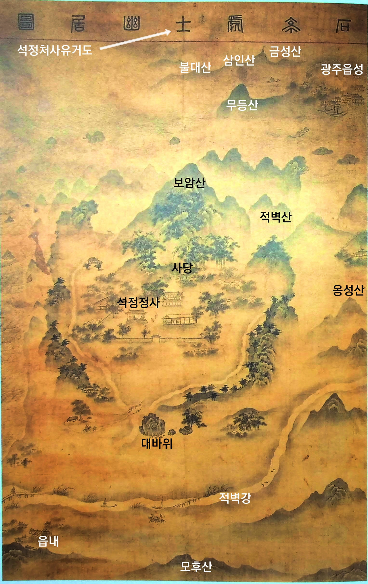 ‘석정처사유거도(石亭處士幽居圖)’는 17세기 후반의 생몰이 알려지지 않은 화가 전충효(全忠孝,?~?)가 그린 실경산수화이다. 김한명(金漢鳴, 1651~1718)이 살던 주거지를 재현한 그림이다. 김한명의 행적은 『석정처사유집』에 행장, 가전, 시문 등의 자료로 정리되었다. 부친은 김의(金誼, 1614~1704)로 91세까지 사셨는데, 아들 김한명은 지극한 효자로 일관하여 오래도록 칭송받았다. 김의는 병자호란으로 짓밟힌 불의를 참지 못하고 동복현 이곳으로 은거한다. 사계 김장생(金長生, 1548~1631)의 아들인 신독재 김집(金集, 1574~1656)의 제자로 춘추대의를 익혔다. 김의의 은둔은 춘추대의의 절의를 실천한 행위이다. 동복의 사람들이 존경하고 따랐고 그의 후손들은 혈연과 학연에서 서인계열에 속하는 가풍을 이어간다. 김의의 외동아들인 김한명은 보암산 아래 유거에서 태어나 이곳에서 생을 마쳤다.