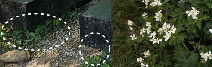 탄소 벤치 아래 식재된 바람꽃 (2024.05.10.), 우측은 바람꽃 개화모습