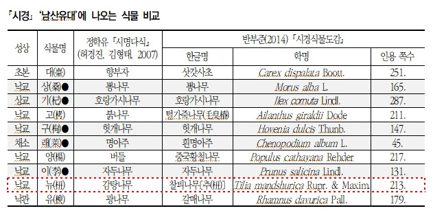 이처럼 『시경』에는 새와 짐승, 풀과 나무, 기물, 지명, 산수, 별자리, 어휘, 생활상이 등장한다. 식물 이름은 총 147개이며, 종류는 136개로 시와 식물이 서로 교감한다. 이 중에서 뉴(杻)는 정학유(丁學游, 1786~1855)의 『시명다식(詩名多識)』에는 감탕나무로 나온다. 대만 생물학자 반부준(潘富俊)의 『시경식물도감(詩經植物圖鑑)』에는 추(杻)로 읽으며〔杻, 椎也, 葉似杏而尖〕 학명은 찰피나무로 파악한다. ‘남산유대’에 나오는 식물을 정학유의 『시명다식』과 반부준의 『시경식물도감』으로 비교하여 정리한다. ‘남산유대’의 식물 10종류 중 뽕나무, 호랑가시나무, 헛개나무, 명아주, 자두나무의 5종의 식물 명칭이 일치한다.