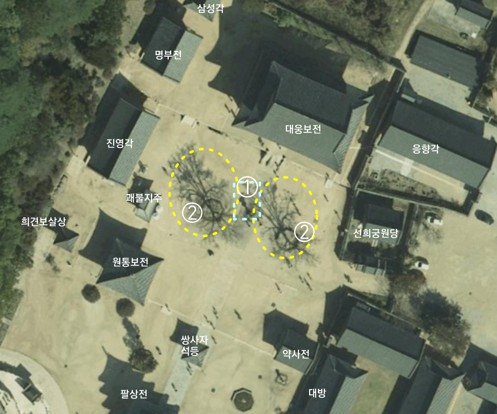 속리산 법주사 하면 제일 먼저 떠오르는 게 대웅보전 경내에서 자라는 찰피나무이다. 사찰의 경내 마당 공간은 행사를 위하여 식물의 도입을 꺼린다. 그럼에도 동선을 고려한 지극히 절제된 대칭 식재의 전형적인 특성을 보인다. 『태종실록』에 ‘예조에서 의례 상정소 제조와 의논하여 악조(樂調)를 올리는’ 기사(태종2년, 1402.06.05.)를 보면 3개의 연회 음악에서 ‘남산유대’를 노래한다. ‘남산유대’의 노래 가사에 찰피나무가 등장한다. ‘남산유대’는 시경『(詩經)』「소아 : 백화지집」에 수록된 시(詩)이다. 시경은 기원전부터 내려온 노래이다. 사서삼경의 삼경 중 하나이다.