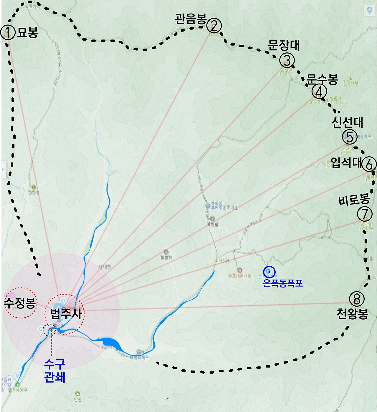 한강 이남의 ‘주산 위의 주산’이랄 수 있는 종산(宗山)은 속리산이다. 종산인 속리산에서 내려온 산줄기가 간룡(幹龍)인데, 두 날개를 편 채 작고 아담한 수정봉을 보듬는 형국이다. 수정봉 정상에서 사방을 두루 살피면 묘봉에서 천왕봉으로 이어지는 산줄기가 장막을 형성한다. 속리산의 산봉우리가 거대한 파도처럼 울퉁불퉁 일렁이며 펼쳐치는 장막이다. 장막(帳幕)은 산세의 흐름이 병풍 펼친 듯 좌우로 겹겹이 가지를 친 모양새를 말한다. 학이 양 날개를 펼치듯 장막을 열었기에 개장(開帳)이 좋은 형세라 말한다. 개장이 좋으면 내룡(來龍)의 생기가 건강하다. 8개의 각 봉우리에서 뻗어 나온 간룡이 법주사를 품은 수정봉으로 조응한다. 수정봉은 법주사의 주산인 현무를 이룬다.