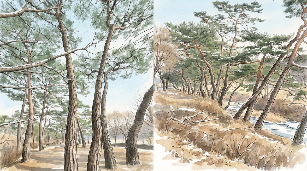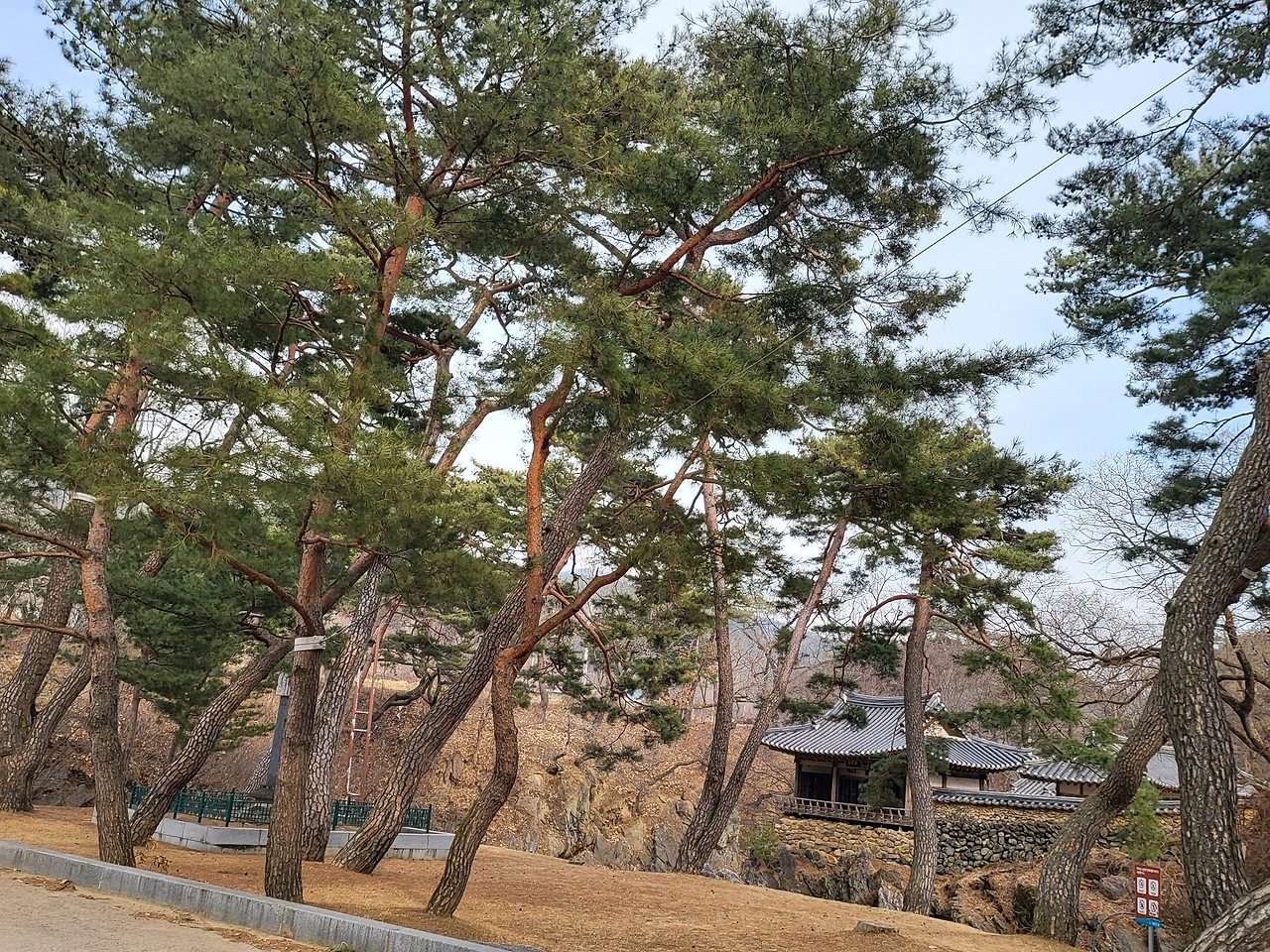 겨울 한복판의 취재 답사인 초간정 원림의 풍치는 다소 경직된 소박함으로 가득하다. 겨울이라는 계절적 제약은 오히려 초간정 경관의 본질적 구조를 더 명확하게 드러낸다. 화려한 꽃과 짙은 녹음이 사라진 겨울 경관은 공간의 뼈대인 지형, 암반, 수목의 골격을 있는 그대로 보여준다. 초간정에서 바라보이는 건너편 사면은 푸른 솔잎으로 선명하다. 오래된 거목의 소나무가 군식 형태로 송림을 이룬다. 소나무 외에도 느티나무, 팽나무, 단풍나무, 때죽나무, 참나무류가 주요 식생이지만 겨울이라 송백의 푸르름만 돋보인다.