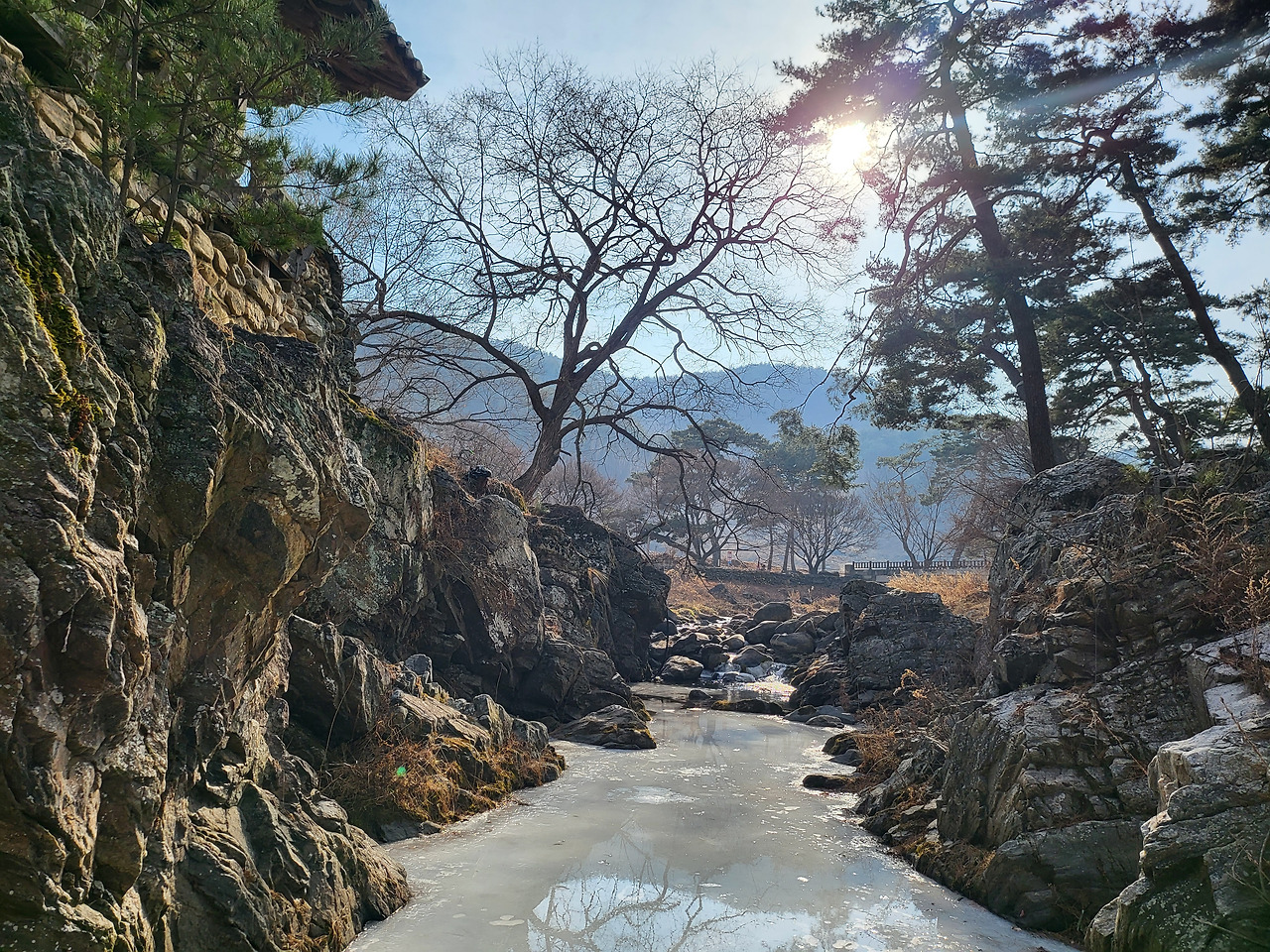 계류의 빙질이 단단하고 깨끗하여 오랜만에 올라서서 발 미끄럼을 타본다. 얼음 위를 걷는 촉각적 체험은 자연과의 직접적이고 물리적인 접촉으로, 단순한 시각적 관조를 넘어 몸으로 자연을 체득하는 ‘신체화된 경관 경험(embodied landscape experience)’이다. 이는 메를로-퐁티(Merleau-Ponty)의 신체 현상학이 강조하는 ‘몸으로 세계를 경험한다’는 지각 이론과 통하며, 한국정원 체험의 신체성을 보여준다.