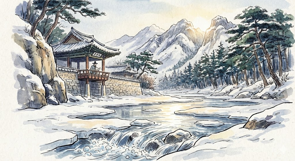 글 읽는 소리도 물 읽는 소리도 시간의 거처로 옮아간다. 세상의 모든 시끄러움을 고요의 깊은 속내에 가둔다. ‘시간의 거처’라는 표현은 공간이 단순히 물리적 장소가 아니라, 시간이 축적되고 기억이 쌓이는 존재론적 거처임을 암시한다. 바슐라르(Bachelard)가 『공간의 시학』에서 말한 ‘친밀한 공간(intimate space)’으로서의 거처, 즉 단순히 머무는 곳이 아니라 존재가 뿌리내린 곳으로서의 장소 개념과 통한다.