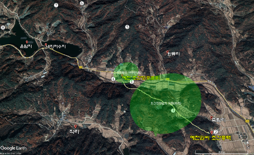 초간정 원림의 외원(外苑) 권역은 초간종택에서 초간정 사이의 동선에 놓인다. 죽림마을, 남티고개, 사시나무골 등을 시간의 흐름에 따라 경관을 빌려서 향유하는 ‘응시이차(應時而借)’의 경관이다. 초간정에서 멀리 있는 경치를 빌려서 조망하는 계곡과 용문산 자락, 농경지 등의 ‘원차(遠借)’의 공간도 초간정 원림의 외원에 해당한다. 이러한 내원·외원의 이중 구조는 초간정을 고립된 은거 공간이 아니라, 마을 공동체와 자연 생태계, 그리고 우주적 질서와 유기적으로 연결된 개방 체계로 만든다. 이는 서구 정원의 담장으로 경계 지워진 폐쇄 공간과 근본적으로 다른 한국정원의 특성이다.