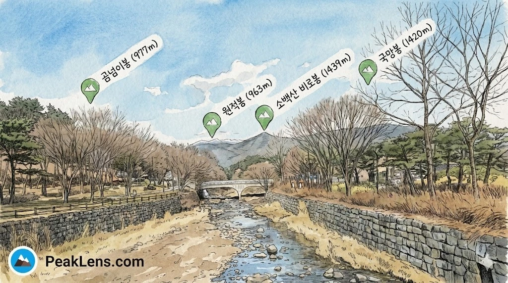 <소백산 비로봉> 소백산 주요 능선(곰넘이봉, 원적봉, 비로봉, 국망봉)을 배경으로 한 소수서원 앞 죽계천의 전경이다. 비로봉에서 시작된 계곡물이 화강암 암반을 따라 흐른다.