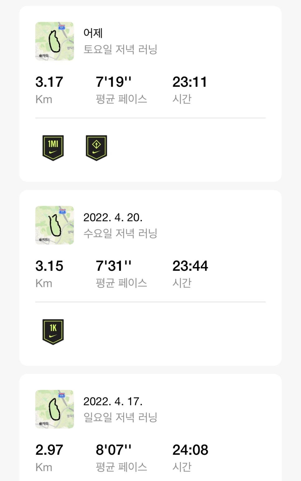 마지막 부근쯤엔 거의 질질 끌려가다시피 완주했지만 계속 뛰다가 멈추니 세상이 돌아버리는 것 같고 얼굴은 터질 것 같았지만 조금 쉬고 나니 너무 개운했다. 웨이트로 흘리는 땀과는 차원이 다른 개운함이 있었다. 아 이래서 뛰는구나라는 생각이 들었다. 그 후로 2번 정도는 혼자 뛰어보게 되었는데 처음에 뛸 때보다 호흡 조절이 가능해지고 조금씩 기록이 단축되었다(그래봤자 3.17km.. 7분 대 페이스ㅋㅋ). 사실 혼자 처음 뛰었을 때 중간중간 멈추고 싶은 생각이 5번 정도 들었다.. 누가 뭐라고 할 사람도 없는데 뭐 어때?라는 생각이 스쳤지만 아, 여기까지 왔는데 멈추면 앞으로 계속 멈추다 뛰다 할 거다. 그리고 처음 지인과 뛰었을 때 "안돼, 멈추지 마"라고 북돋아주던 목소리가 자동 응답기처럼 들렸다. 멈추지 말자는 생각으로 그렇게 죽어라 완주했다. 다 뛰었을 때 따라오는 개운함은 혼자 뛰고 났을 때에 배가 되었다.