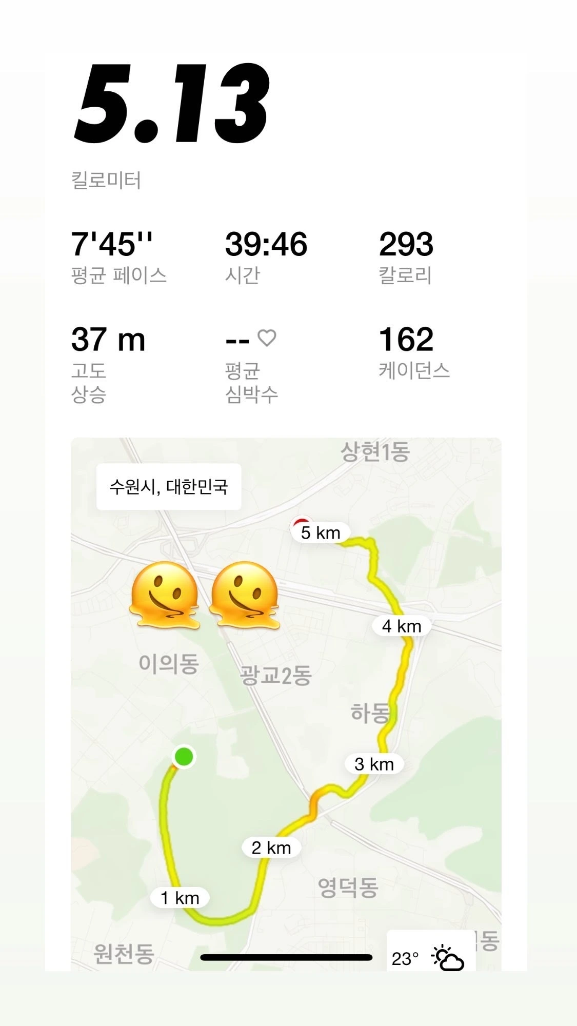 스승님의 계략이었다. 오늘 속도를 내겠다는 얘기는 없었는데..! 3km를 지나서 턴을 할 때 뭔가 더 힘들더라니.. 남은 2km 구간부터 천천히 속도를 올리셨던 거다. 그냥 같이 뛰어주시기만 하는 줄 알았는데 페이스 조절까지 고려해서 나름 나를 훈련시키고 계셨던 것이다. 감동이지만.. 생각보다 너무 힘들잖아요..!! 결국 나는 100m를 남겨두고 멈춰버렸고 4.99km라는 아쉬운 기록을 남겨버렸다 ㅠㅠ 내가 멈춰서 정신 못 차리고 있으니 자긴 좀 더 뛰고 오겠다며 얄밉게 저 멀리로 쌩- 가버리는 스승님.. 그래도 페이스를 점차 높이면서 달렸기 때문에 기록이 썩 나쁘지는 않았다. 하지만 아쉬운 0.01km... 기록을 보더니 스승님도 함께 아쉬워하셨다. 다음엔 무조건 숫자를 딱 맞춰야지 다짐하며 다음 5km 러닝을 고대했다.